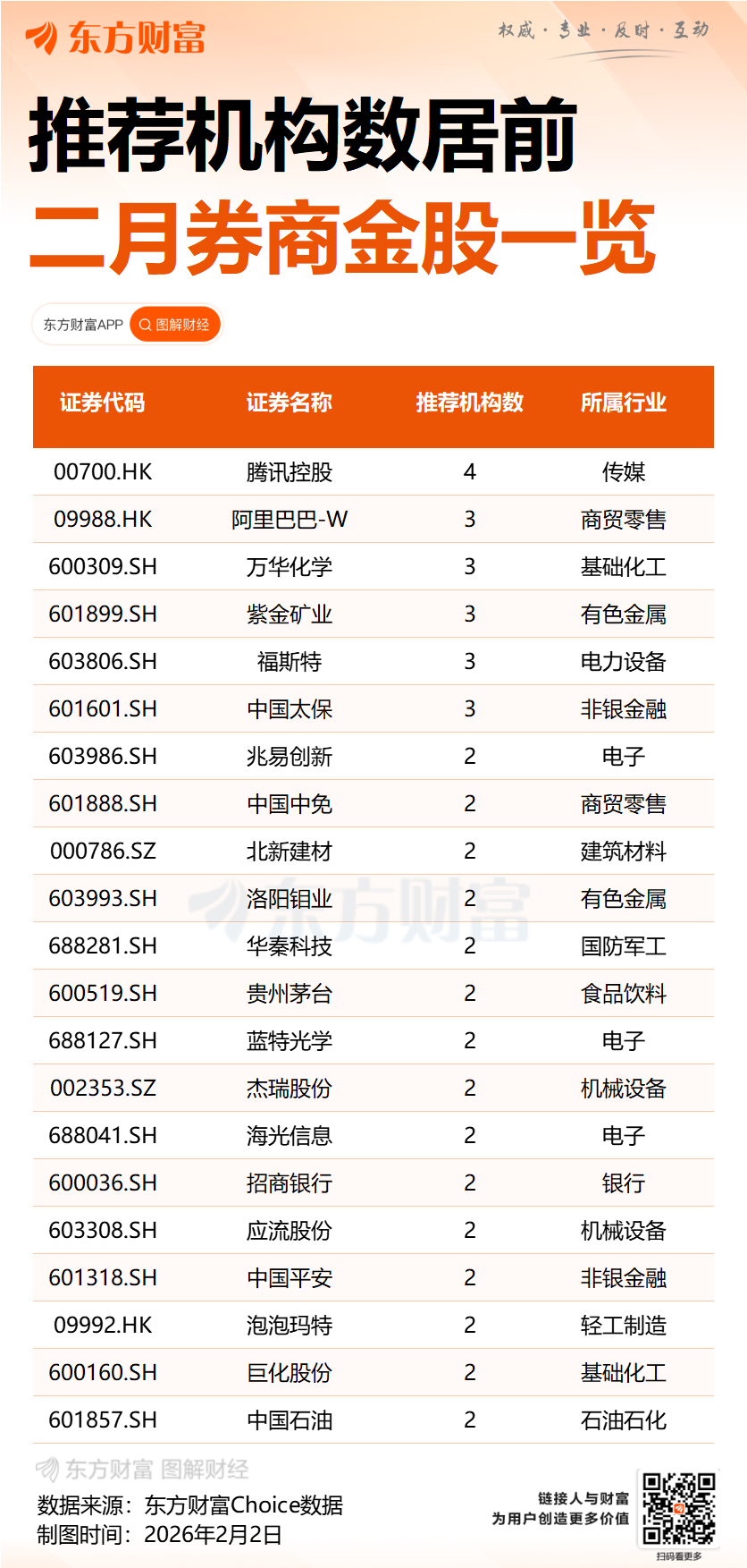 2026年2月已至,截至1月30日,共有9家券商机构合计推荐67股为2月金股(下文简称“金股”)。