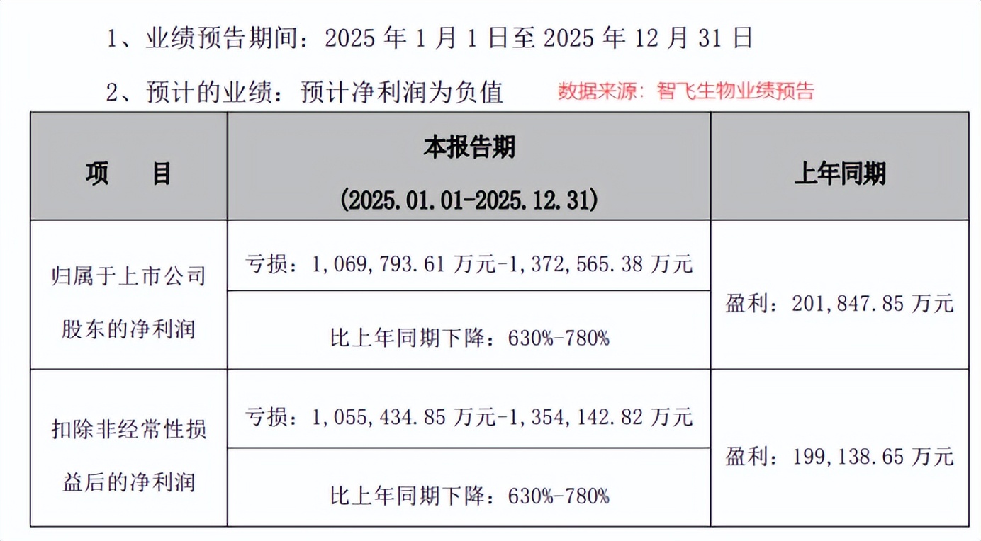 几乎在发布贷款公告的同一时间,智飞生物披露的 2025 年业绩预告,犹如一记重锤,再次震惊了市场。公告显示,公司预计 2025 年全年归母净利润亏损 106.98 亿 - 137.26 亿元,同比暴跌 630% - 780%。这一数字,不仅创下了智飞生物上市以来的首次年度亏损记录,而且亏损幅度之大,令人咋舌。