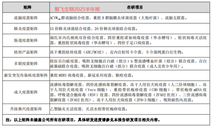 截至 2025 年半年报,智飞生物的在研疫苗矩阵十分丰富,累计在研项目超过 30 项,达到了 34 项。这些项目涵盖了多个领域,针对不同年龄段和疾病类型,为公司未来的产品布局提供了充足的储备。