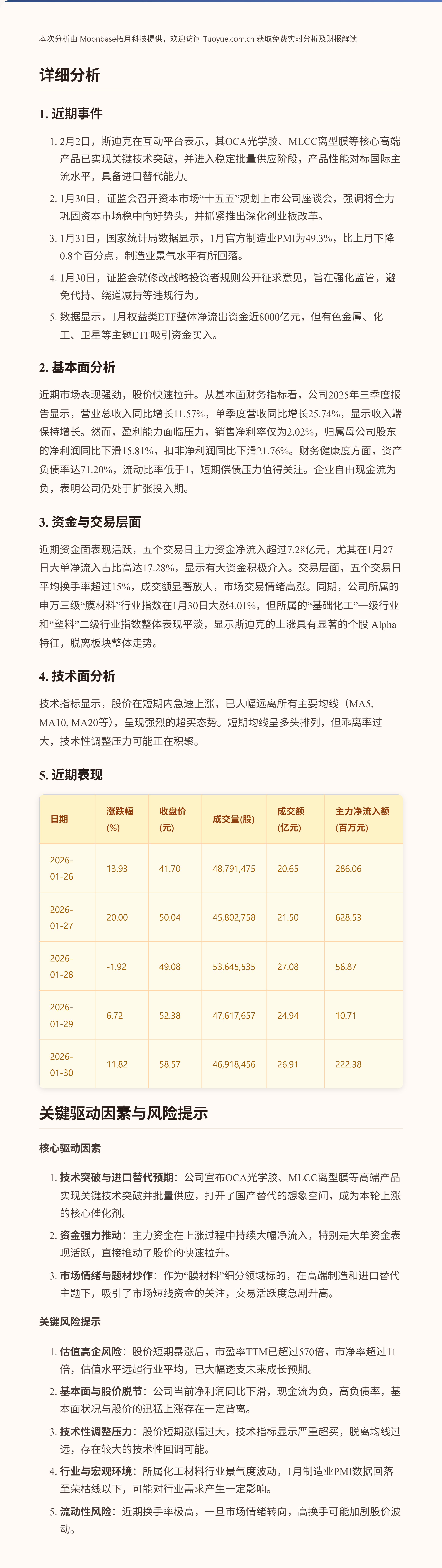 斯迪克股价在最近五个交易日内大幅上涨,累计涨幅超过50%。这一强劲表现主要受到公司宣布其OCA光学胶、MLCC离型膜等核心高端产品实现关键技术突破并进入批量供应的消息驱动,市场对其进口替代前景反应积极。关键亮点在于公司技术突破可能带来新的增长点,同时需要关注其估值水平已大幅攀升。
