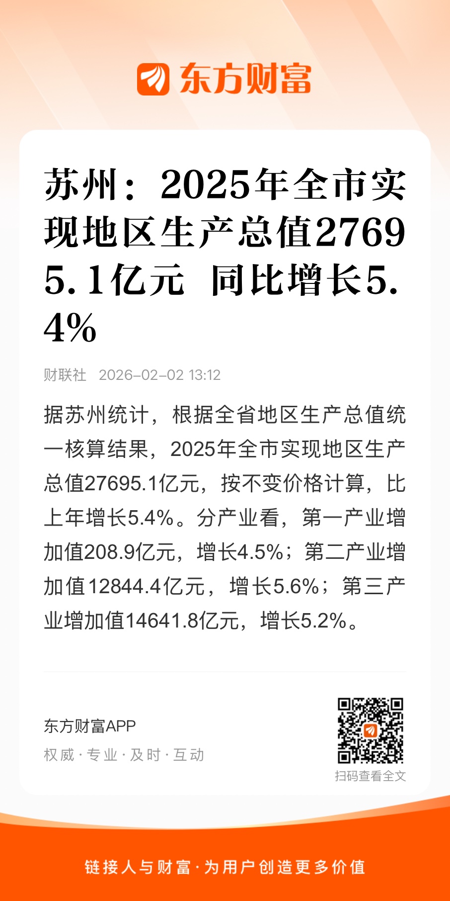 据苏州统计,根据全省地区生产总值统一核算结果,2025年全市实现地区生产总值27695.1亿元,按不变价格计算,比上年增长5.4%。分产业看,第一产业增加值208.9亿元,增长4.5%;第二产业增加值12844.4亿元,增长5.6%;第三产业增加值14641.8亿元,增长5.2%。