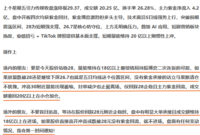 文章我也说过了只要股价能在28附近企稳进场那就是没错的,场内外的朋友可以回顾一下内容。午后还是看好二连板的机率。