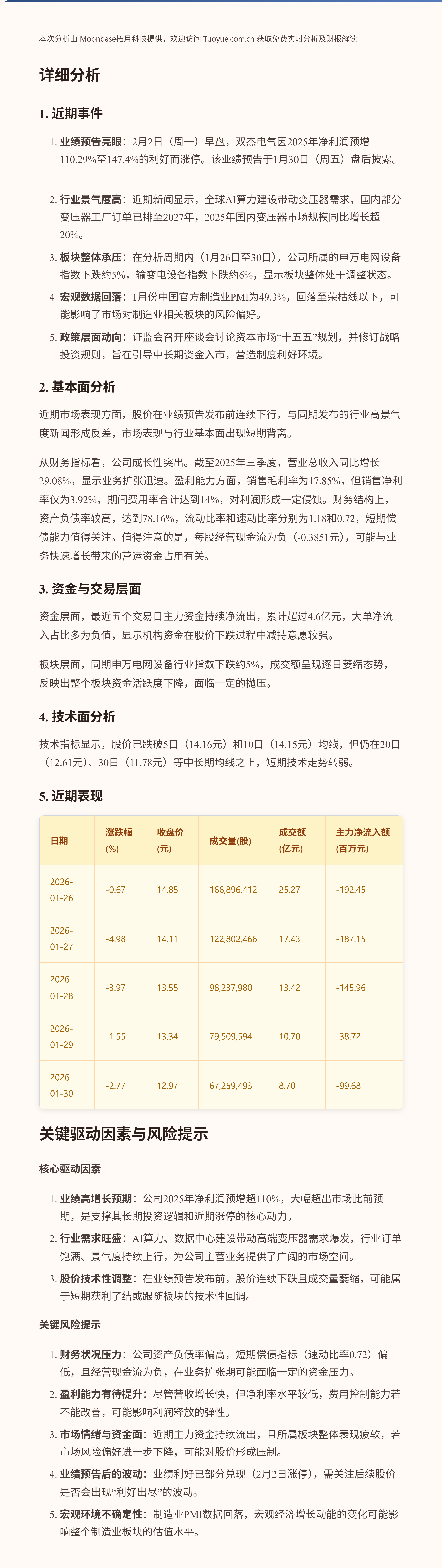 双杰电气股价在最近五个交易日连续下跌,累计跌幅超过13%。股价回调可能与市场整体情绪及所属电力设备板块走弱有关,期间公司主力资金呈现持续净流出状态。值得关注的是,公司在1月30日盘后发布了2025年净利润预增超110%的业绩预告,这可能为后续股价表现带来新的驱动因素。