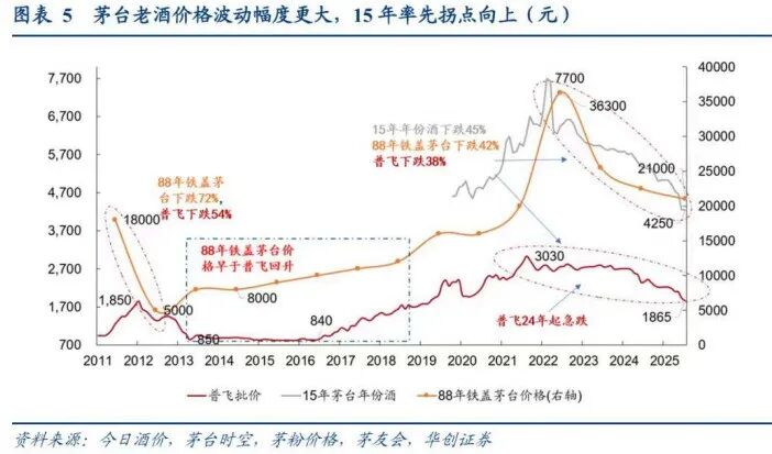 其次,老酒供给硬约束,喝一瓶少一瓶,受需求弹性的影响更大,所以茅台老酒价格作为白酒周期的观察指标,还是比较有效的。