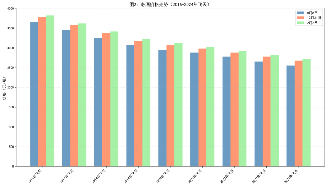 我从“老酒头条”账号上找到了去年8月8日开号日、去年12月31日以及今天2026年2月2日的老批次飞天的价格,用Claude Code做了一组可视化图表。