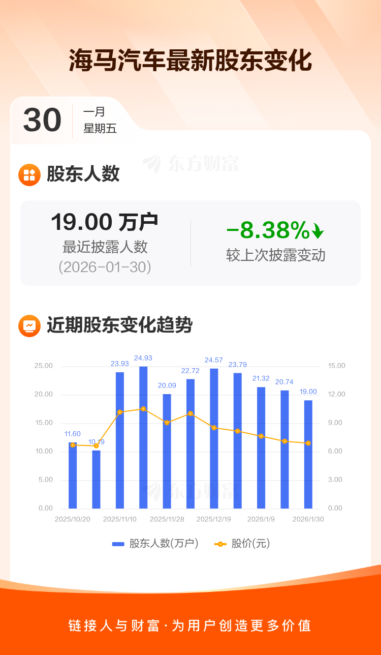 海马汽车最新披露数据显示,截至1月30日公司股东户数为19.00万户,较上期(2026年1月20日)减少1.74万户,降幅为8.38%。户均持有流通股数量由上期的7919股上升至8643股,户均持股金额由上期的5.61万元增加至5.95万元。