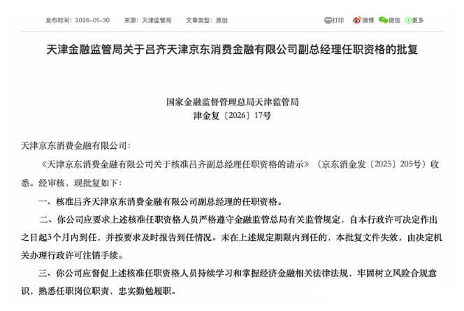 【吕齐将任职京东消费金融副总经理】1月30日,国家金融监督管理总局天津监管局更新