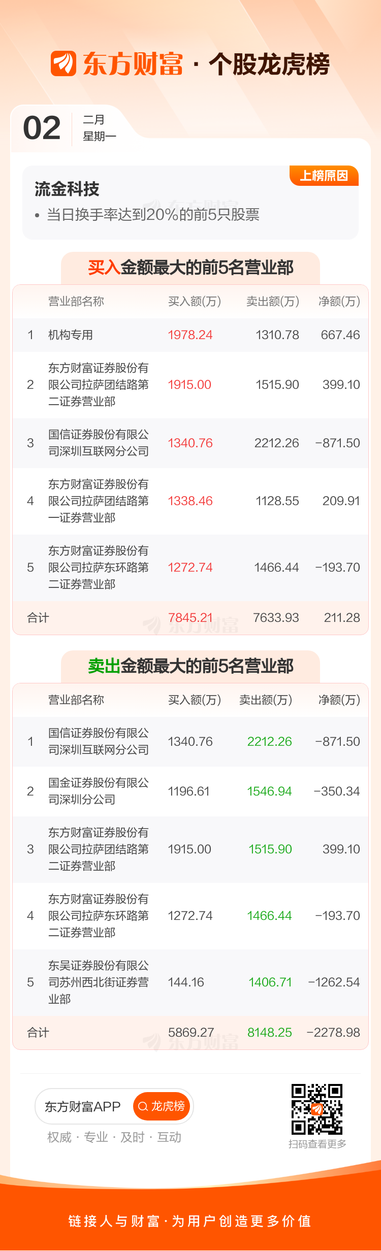交易所2026年2月2日公布的交易公开信息显示,流金科技因成为当日换手率达到20%的前5只股票上榜。流金科技当日收报13.42元,涨跌幅2.44%,偏离值30.68%,换手率30.68%,成交额9.83亿。