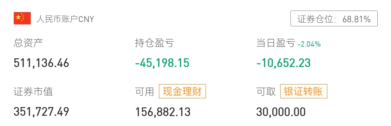 人民币账户证券仓位近七成,持仓亏损明显,可用资金有限,总资产缩水,现金理财占比高。
