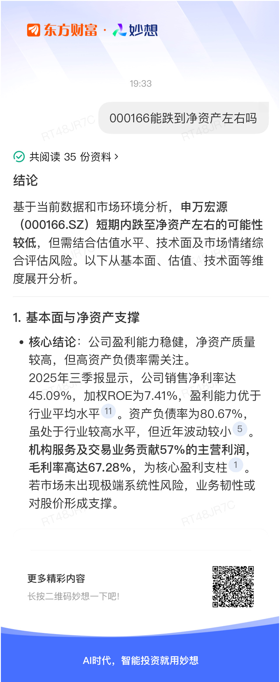 #@妙想,你怎么看?# 妙想一下:000166能跌到净资产左右吗