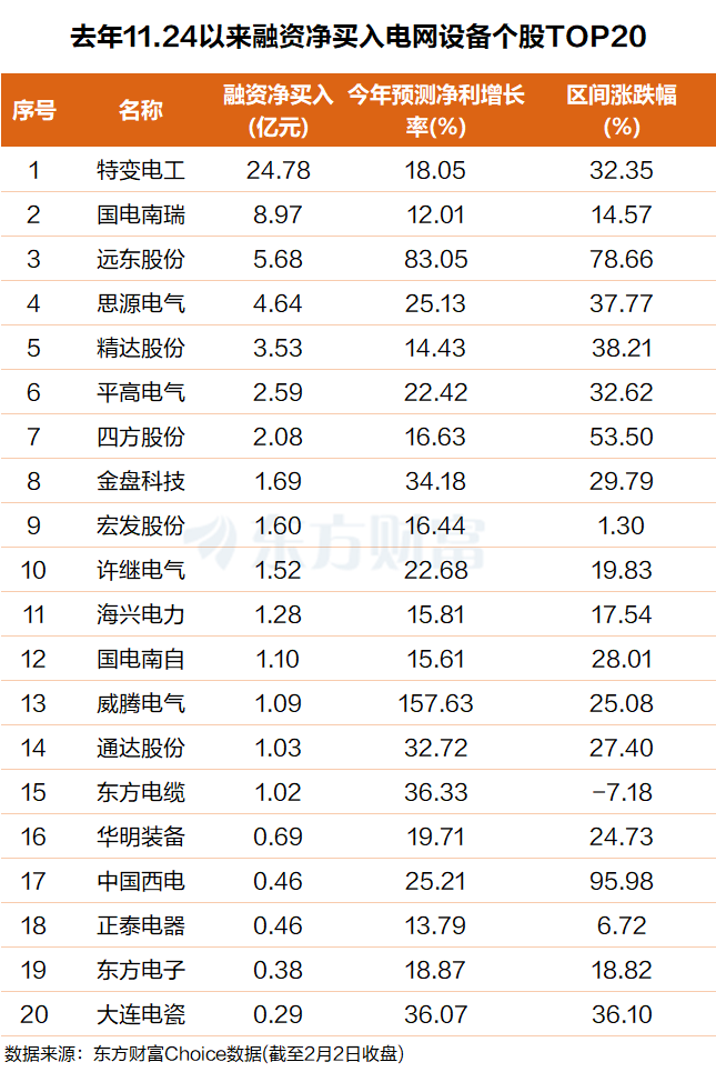 东方财富Choice数据显示,自去年11月24日,电网设备板块指数阶段性见底以来,杠杆资金抢筹了一批板块个股,其中不乏机构一致预测今年净利润增速较高的票。