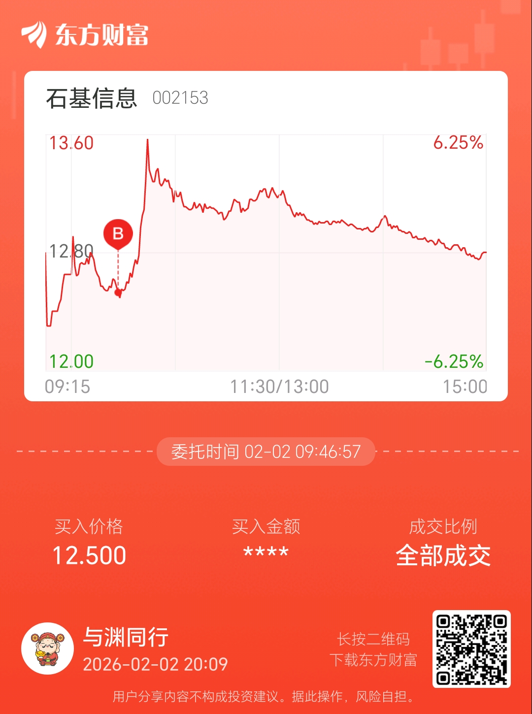 委托标的:明天继续做T买卖方向:石基信息笔记:12.5进13.26出