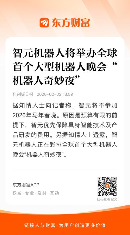 《科创板日报》2日讯,据知情人士向《科创板日报》记者称,智元将不参加2026年马年春晚。原因是预算有限的前提下,智元优先保障具身智能技术及产品研发的费用。另据知情人士透露,智元机器人正在彩排全球首个大型机器人晚会“机器人奇妙夜”,该晚会由数百台各类机器人主导,集合唱歌、跳舞、小品、走秀等多元节目,将于近期上线直播。