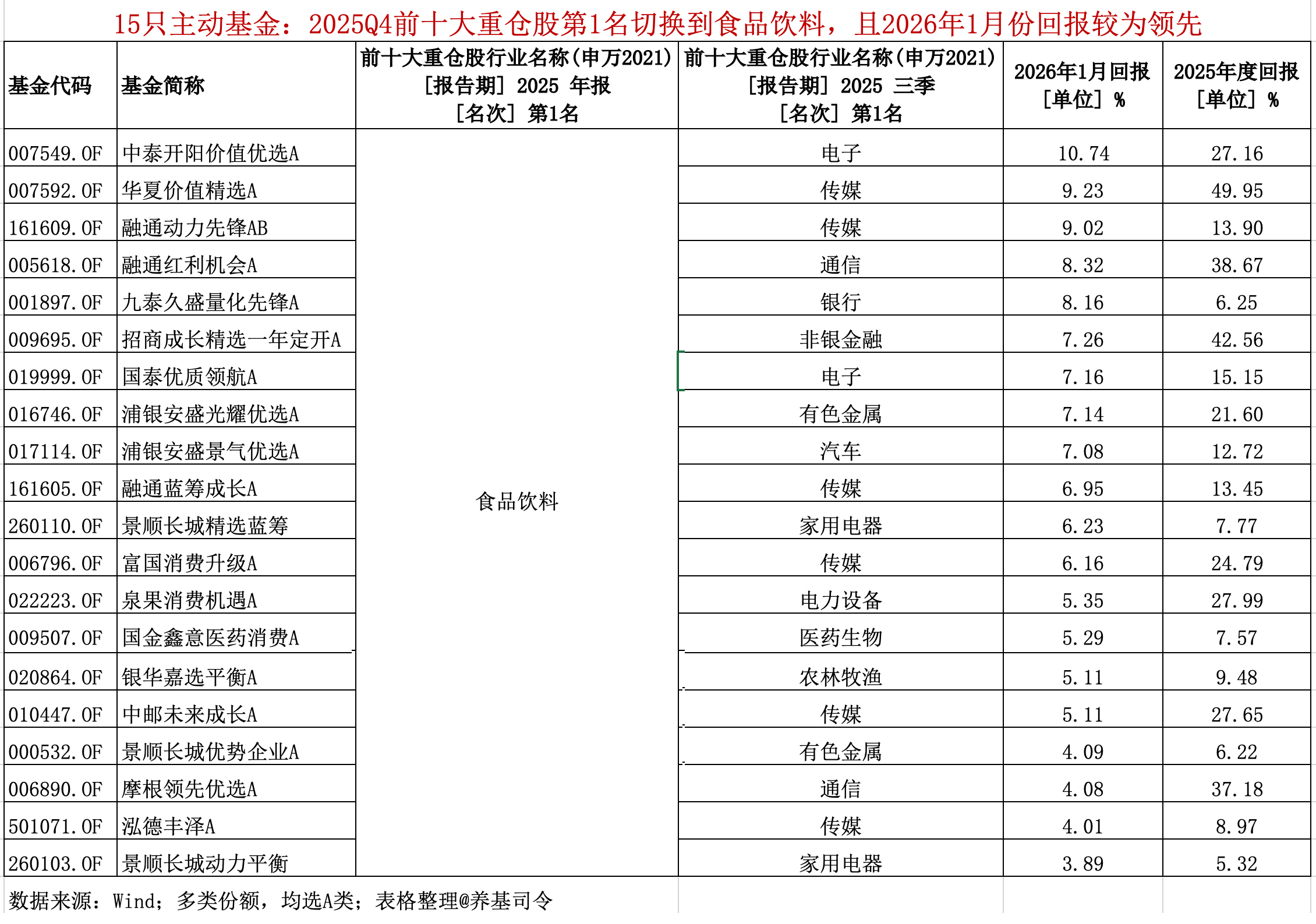 Wind统计显示,三类主动权益基金(普通股票型、偏股混合型、灵活配置型)中,一共有74只产品(如有多类份额,均选A类)2025Q4季报前十大重仓股第1名行业切换到了食品饮料,而2025Q3季报却是其它行业,譬如电子、传媒、银行、通信、有色金属、汽车、家用电器。