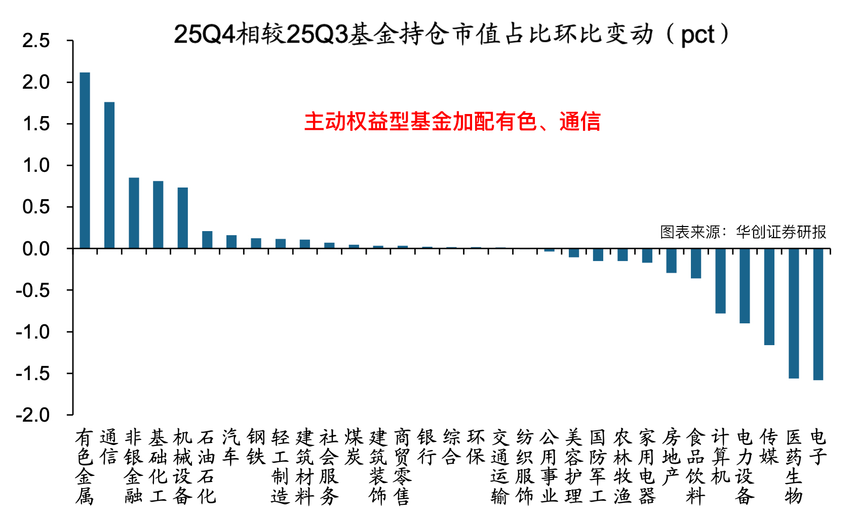 最新披露的2025Q4公募季报显示,主动基金们加仓有色、通信、非银金融、基础化工、机械设备等行业,减仓电子、医药生物、传媒、电力设备、计算机等行业。其中,囊括了白酒股的食品饮料行业,同样有所减持(环比减少0.4%),贵州茅台持仓金额从第二位退到了第四位。但是,相对于自由流通市值的占比,食品饮料环比超配了0.7个百分点。