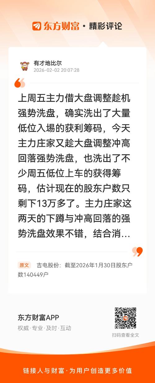 上周五主力借大盘调整趁机强势洗盘,确实洗出了大量低位入埸的获利筹码,今天主力庄家又趁大盘调整冲高回落强势洗盘,也洗出了不少周五低位上车的获得筹码,估计现在的股东户数只剩下13万多了。主力庄家这两天的下蹲与冲高回落的强势洗盘效果不错,结合消息面的利好及更名后资产重组的强烈预期,可能随时会掀起一轮轰轰烈烈的主升浪行情! 我在《吉电股份:截至2026年1月30日股东户数140449户》的评论获得了大家的关注。