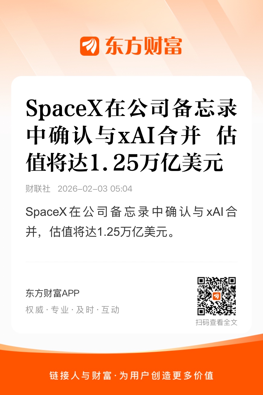 当地时间2月2日,太空探索技术公司(SpaceX)在官网发布由马斯克署名的声明,确认与人工智能企业xAI公司合并。声明称,合并后公司将整合人工智能、火箭、天基互联网、移动设备直连的通信。