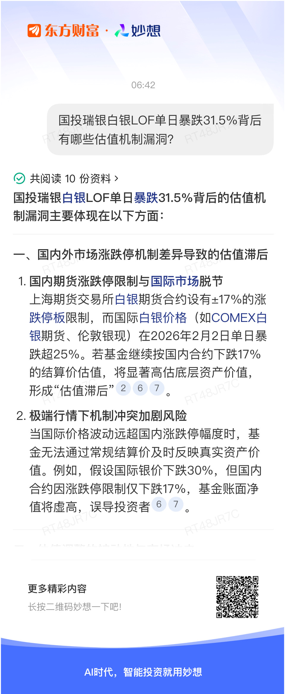 #@妙想,你怎么看?# 妙想一下:国投瑞银白银LOF单日暴跌31.5%背后有哪些估值机制漏洞?