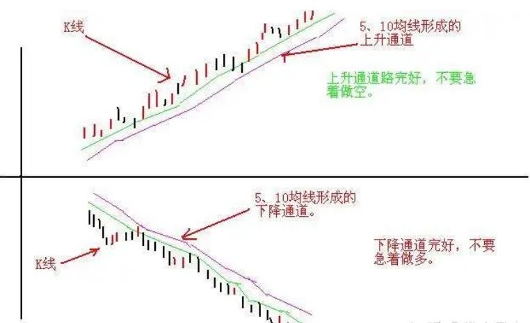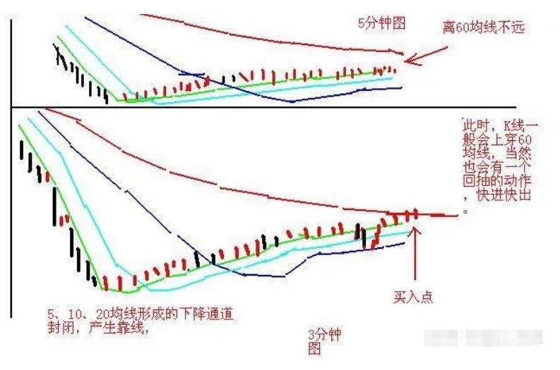 条件1、在3分钟图上,下降通道已封闭,5、10、20均线已走平粘合,正在靠近红色的60均线。2、在5分钟图上,红色60均线开始走平,或已经走平。