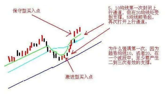 条件1、均线处于上升中,2、 5、10均线第一次封闭通道下行,K线在20均附近止跌。
