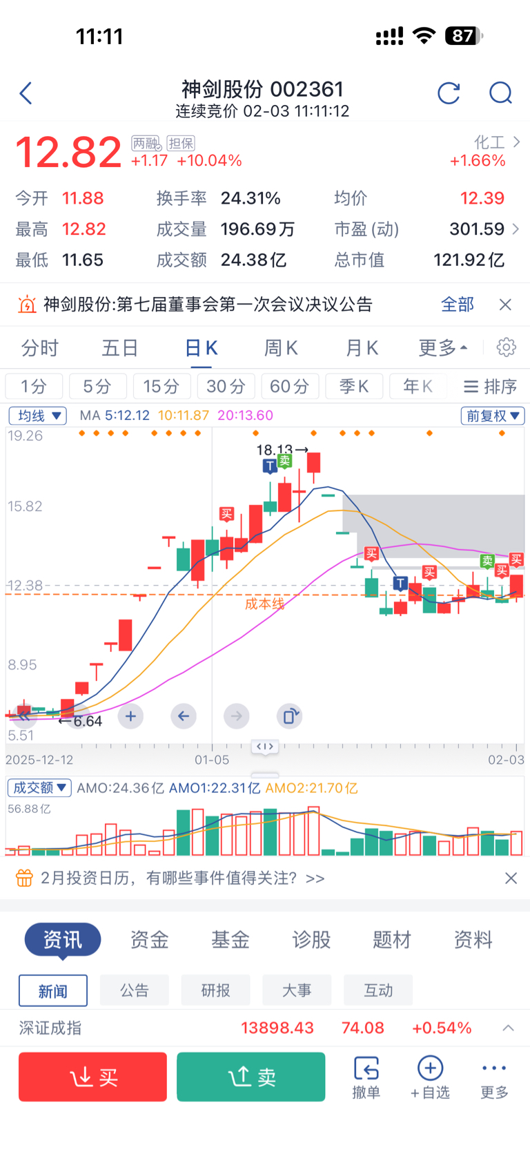 昨天尾盘买了点,今天看商业航天板块反弹了,神剑跟上就追入,目前把之前亏损的5个点都赚回来了还有盈余。争取过年前画上一个圆满句号。