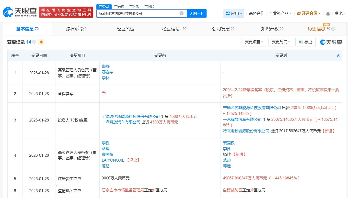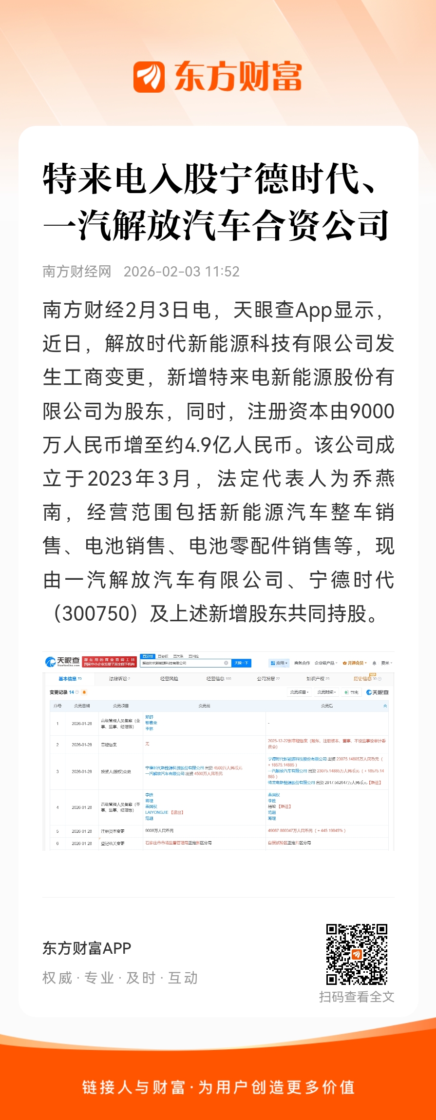 南方财经2月3日电,天眼查App显示,近日,解放时代新能源科技有限公司发生工商变更,新增特来电新能源股份有限公司为股东,同时,注册资本由9000万人民币增至约4.9亿人民币。该公司成立于2023年3月,法定代表人为乔燕南,经营范围包括新能源汽车整车销售、电池销售、电池零配件销售等,现由一汽解放汽车有限公司、宁德时代(300750)及上述新增股东共同持股。