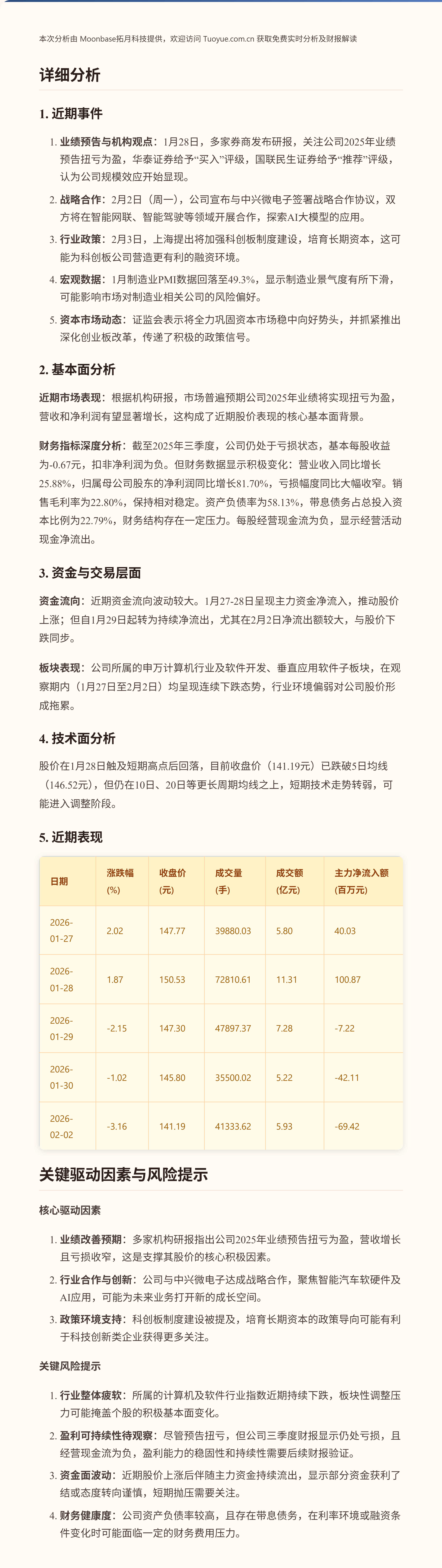 $经纬恒润-W(SH688326)$ 【欢迎点赞关注反馈!主页有更多精彩解读和分析哦~】经纬恒润-W近期股价呈现冲高回落态势。1月28日股价上涨主要受到机构发布积极业绩预告研报的推动,但随后几个交易日股价连续下跌,可能与同期计算机行业整体走弱以及市场对公司战略合作消息反应平淡有关。关键亮点在于公司预告2025年业绩实现扭亏,基本面出现改善迹象。