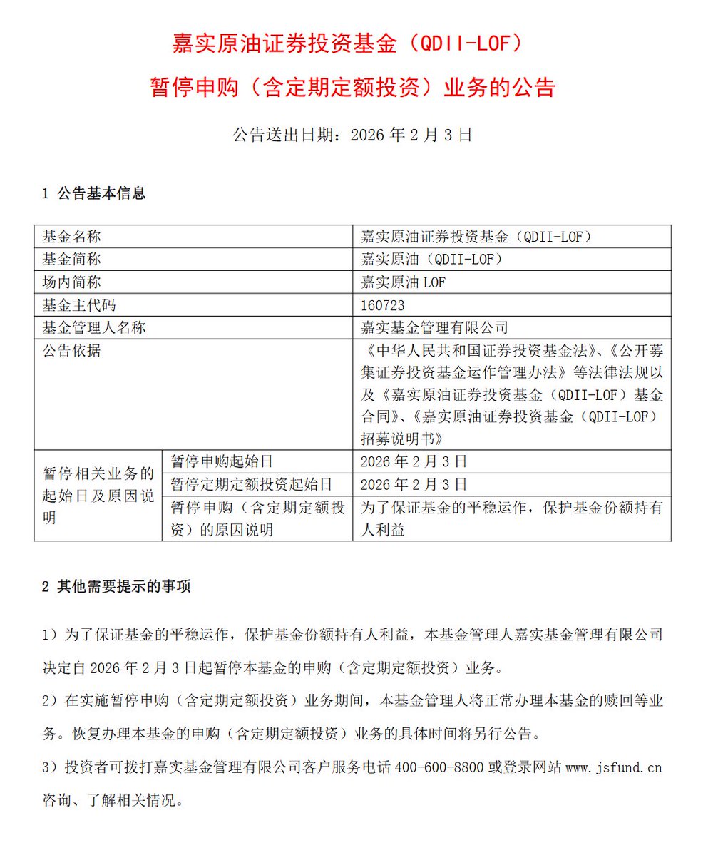 嘉实黄金LOF与嘉实原油LOF自2026年2月3日起暂停基金申购业务。