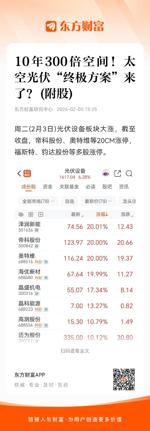周二(2月3日)光伏设备板块大涨,截至收盘,帝科股份、奥特维等20CM涨停,福斯特、钧达股份等多股涨停。