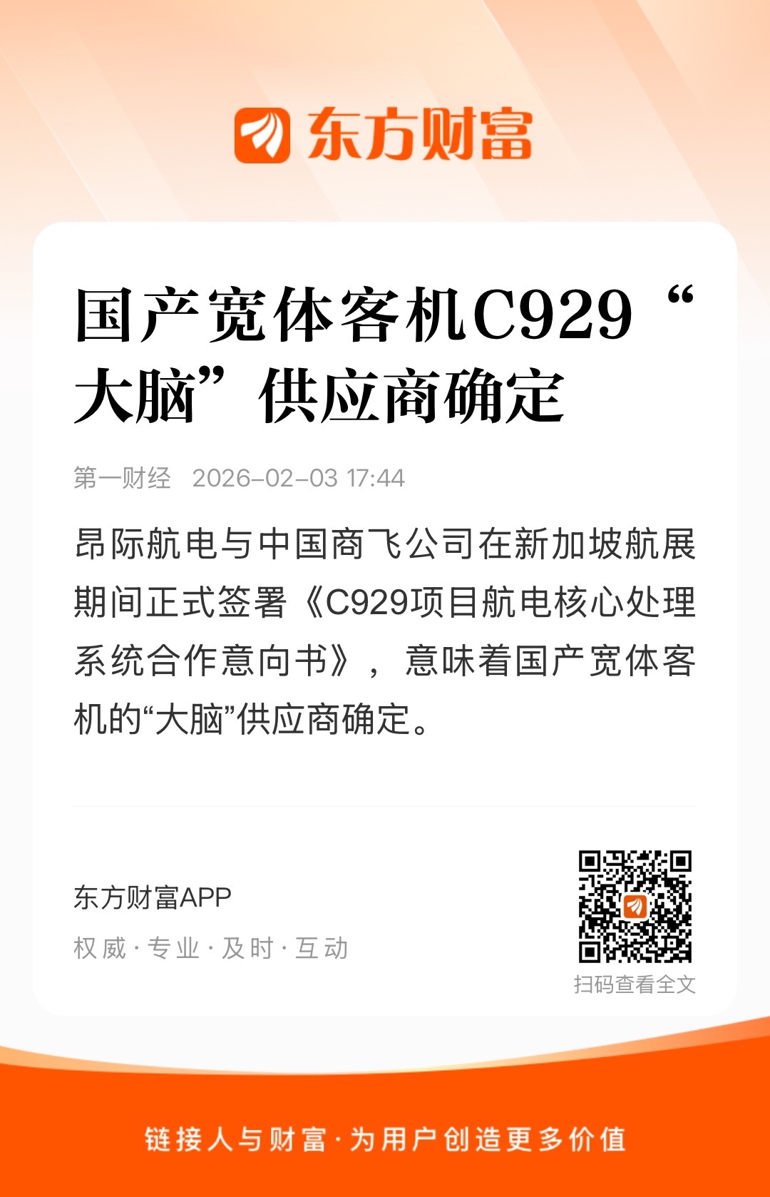 昂际航电与中国商飞公司在新加坡航展期间正式签署《C929项目航电核心处理系统合作意向书》,意味着国产宽体客机的“大脑”供应商确定。C929飞机是中国商飞首款自主研发的远程宽体客机,航电系统相当于飞机的“大脑和中枢神经系统”,昂际航电由GE航空航天和中航工业集团平股合资组建,此前已是国产C919飞机航电系统供应商。