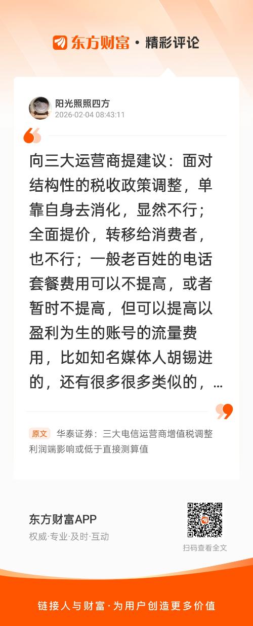 华泰证券研报表示,2026年2月1日,三大电信运营商发布公告表示,自2026年1月1日起,利用固网、移动网、卫星、互联网,提供手机流量服务、短信和彩信服务、互联网宽带接入服务的业务活动适用的税目由增值电信服务调整为基础电信服务,对应的增值税税率将由6%调整为9%。华泰证券认为虽然此次税目调整将对公司短期收入及利润产生影响,但一方面,运营商正在积极推进算力服务、智能服务在内的科技转型升级,收入结构有望进一步优化;另一方面,随着AI运维的普及,成本费用端有望继续下行。综上,华泰证券认为最终运营商受到的利润端影响或低于直接测算值。