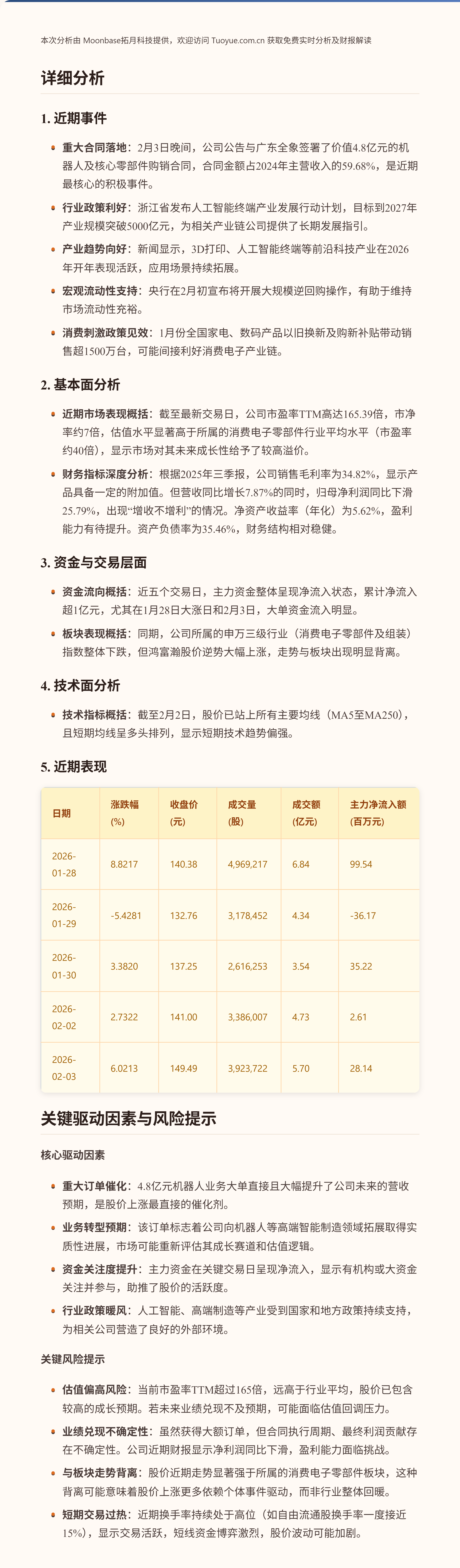 $鸿富瀚(SZ301086)$ 【欢迎点赞关注!留言你想看的代码,立即奉上!主页有更多精彩解读和分析~】鸿富瀚股价在最近五个交易日呈现震荡上行态势,累计涨幅显著。股价的主要驱动因素可能包括公司宣布签署了价值4.8亿元的机器人业务大单,该合同金额约占公司2024年营收的近60%,为未来业绩提供了重要支撑。同时,市场对人工智能、机器人等前沿科技板块的关注度提升,也为股价提供了积极的交易氛围。