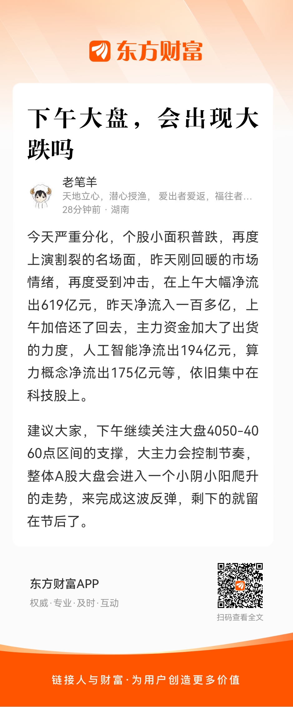 建议大家,下午继续关注大盘4050-4060点区间的支撑,大主力会控制节奏,整体A股大盘会进入一个小阴小阳爬升的走势,来完成这波反弹,剩下的就留在节后了。