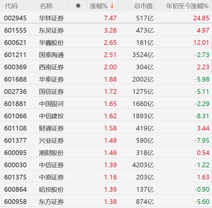 A股券商股走强,其中,华林证券涨超7%,东吴证券涨超3%,华鑫股份、国泰海通、西南证券涨超2%。