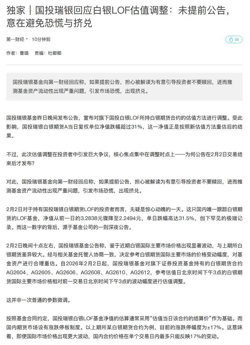 国投瑞银基金昨日晚间发布公告,宣布对旗下国投白银LOF所持白银期货合约的估值方法进行调整