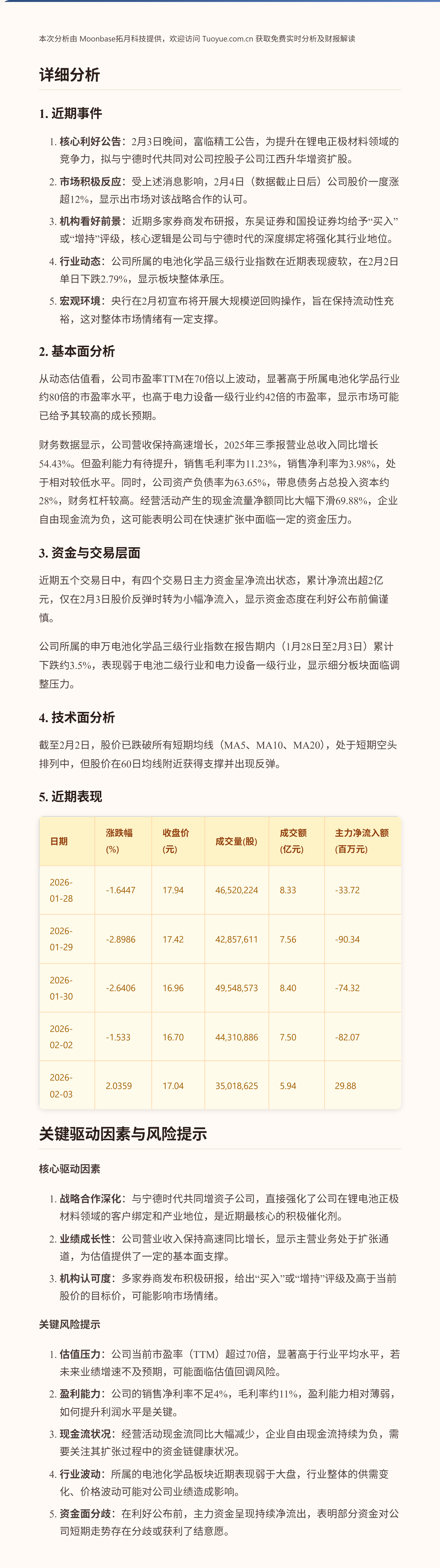 富临精工股价近期呈现先抑后扬的走势,主要受到行业整体调整及公司一则重大利好消息的共同影响。在连续四个交易日下跌后,公司于2月3日晚间公告拟与宁德时代共同对子公司增资扩股,次日股价应声大幅反弹。关键亮点在于公司与行业龙头的战略合作深化,但公司估值水平相对较高且近期资金呈流出状态。