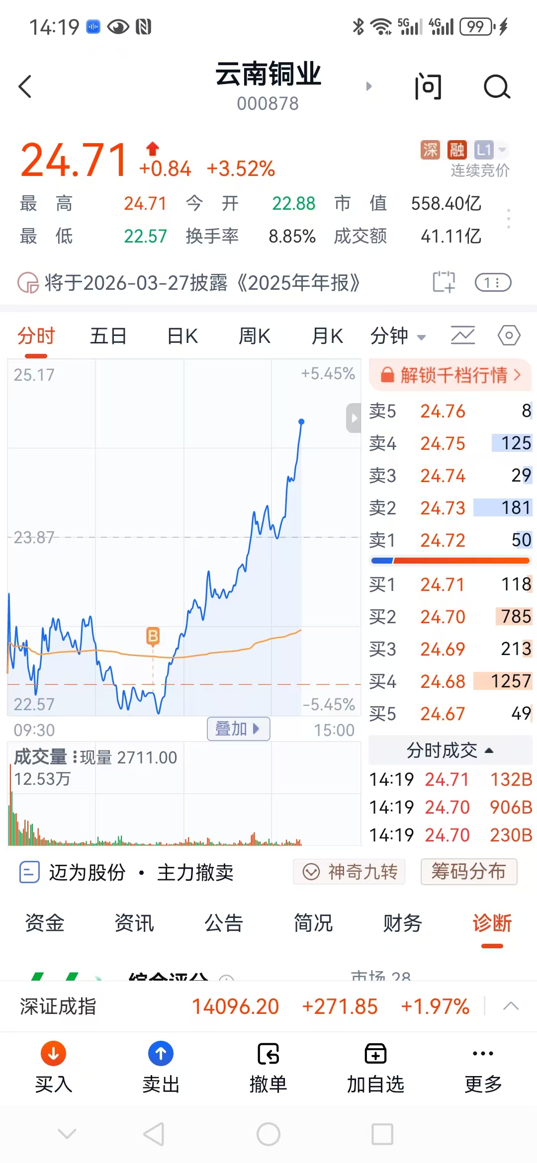 也是卖飞了神剑,担心做倒T,普涨行情又不甘心空着仓位,看到铜业最近超跌,深水区换手承接还行,于是,在-5的位置搞了一丢丢,买入后几分钟就拉升了,真是舒心啊。晚上看沪铜期货也在拉升,估计明天溢价可观。