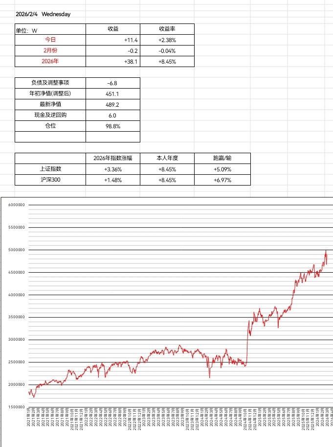 2026.2.4周三今天+11.4w(+2.38%)2026年+38.1w(+8