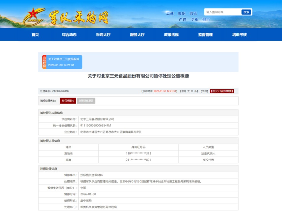 最近,互联网上流传一则消息和一个截图,军队采购网发布的一则处罚通知引发行业震动:北京三元食品股份有限公司因在投标过程中提供虚假材料,被暂停参加全军物资工程服务采购活动资格,处罚自1月30日起正式生效。