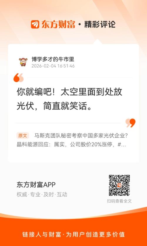 你就编吧!太空里面到处放光伏,简直就笑话。你要知道,火箭运送费用每公斤1万元美元, 路灯按2公斤30W算,这块光伏运费就2万美元。我在《马斯克团队秘密考察中国多家光伏企业?晶科能源回应:属实,公司股价20%涨停,#光伏板块集体上涨》的评论获得了大家的关注。
