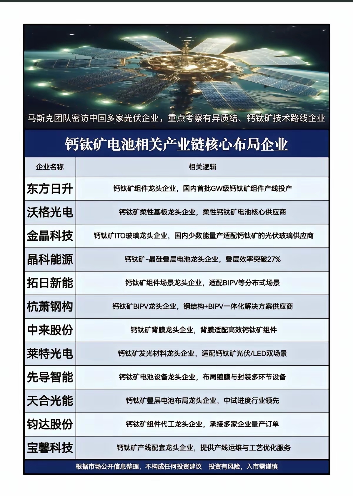 钙钛矿电池技术路线!媒体爆料,马斯克团队秘访中国多家光伏企业,重点考察有异质结、