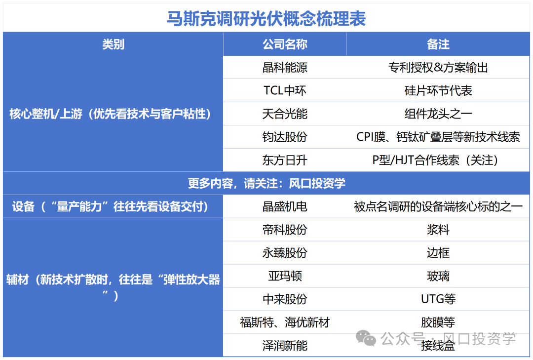 马斯克团队被曝上周密集调研中国光伏产业链,公司名单直指硅片、电池组件与设备三大核心环节,这类“跨界甲方”信号往往比价格波动更值得盯紧。