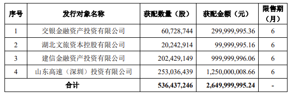 公告显示,四家获配对象分别为交银金融资产投资有限公司(获配3亿元)、湖北文旅资本控股有限公司(获配1亿元)、建信金融资产投资有限公司(获配10亿元)以及山东高速(深圳)投资有限公司(获配12.5亿元)。