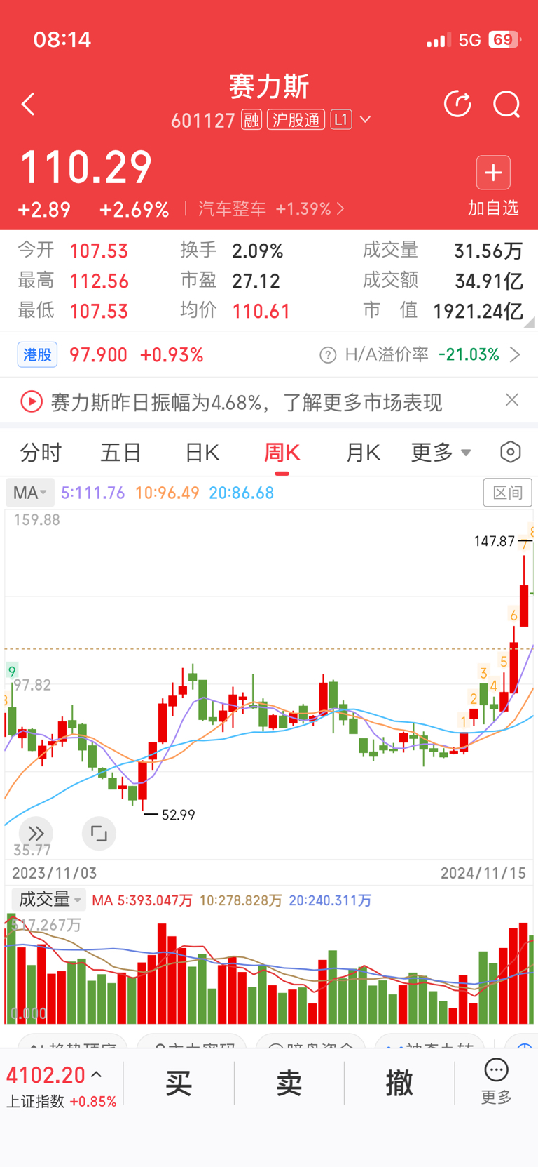 信维通信最多回调到94*35%=62附近,由于信维通信对应的商业航天是确定性大题材 ,预计不会如塞力斯那样回调过多(塞力斯的汽车销量是边走边看的),如果辅助信维通信大单公布和业绩体现,大概率走胜宏科技的走势,再不济也会全年震荡,长线一路向下不回头的概率极低。