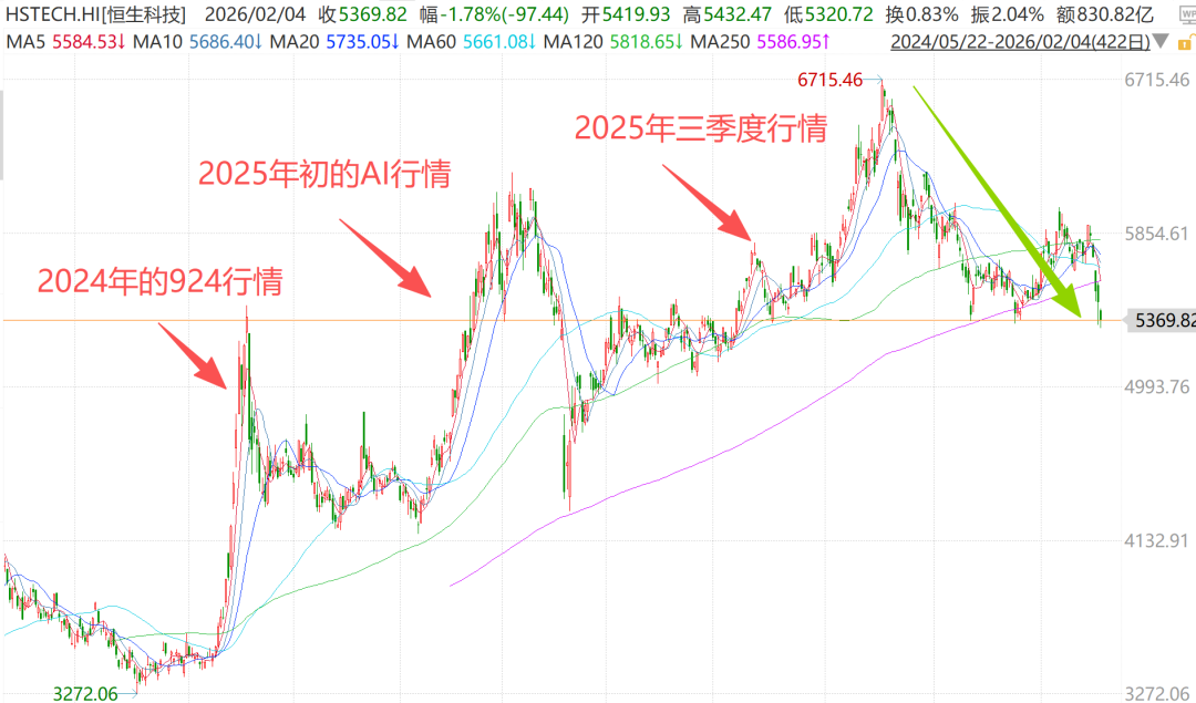 从最近两年恒生科技的走势来看,每次创新高之后都会有一次比较大的回调。例如2024年的"924行情"、2025年初的AI行情,以及2025年三季度行情,恒生科技都是在创新高之后经历比较大的回调。