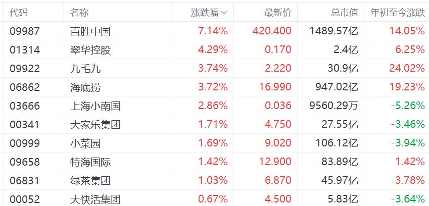 春节假期临近,港股市场餐饮股逆势上涨,其中,百胜中国涨超7%,翠华控股涨超4%,九毛九、海底捞涨近4%,上海小南国涨近3%。
