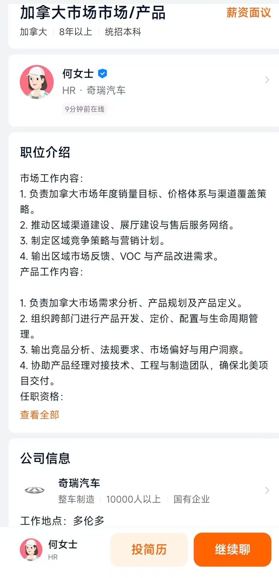 奇瑞在产品与市场岗位上采取了“双地点”配置。产品与市场岗位分别设在芜湖和加拿大多伦多市。界面新闻获悉,加拿大产品与市场岗位应聘人员需三月或者四月到岗。