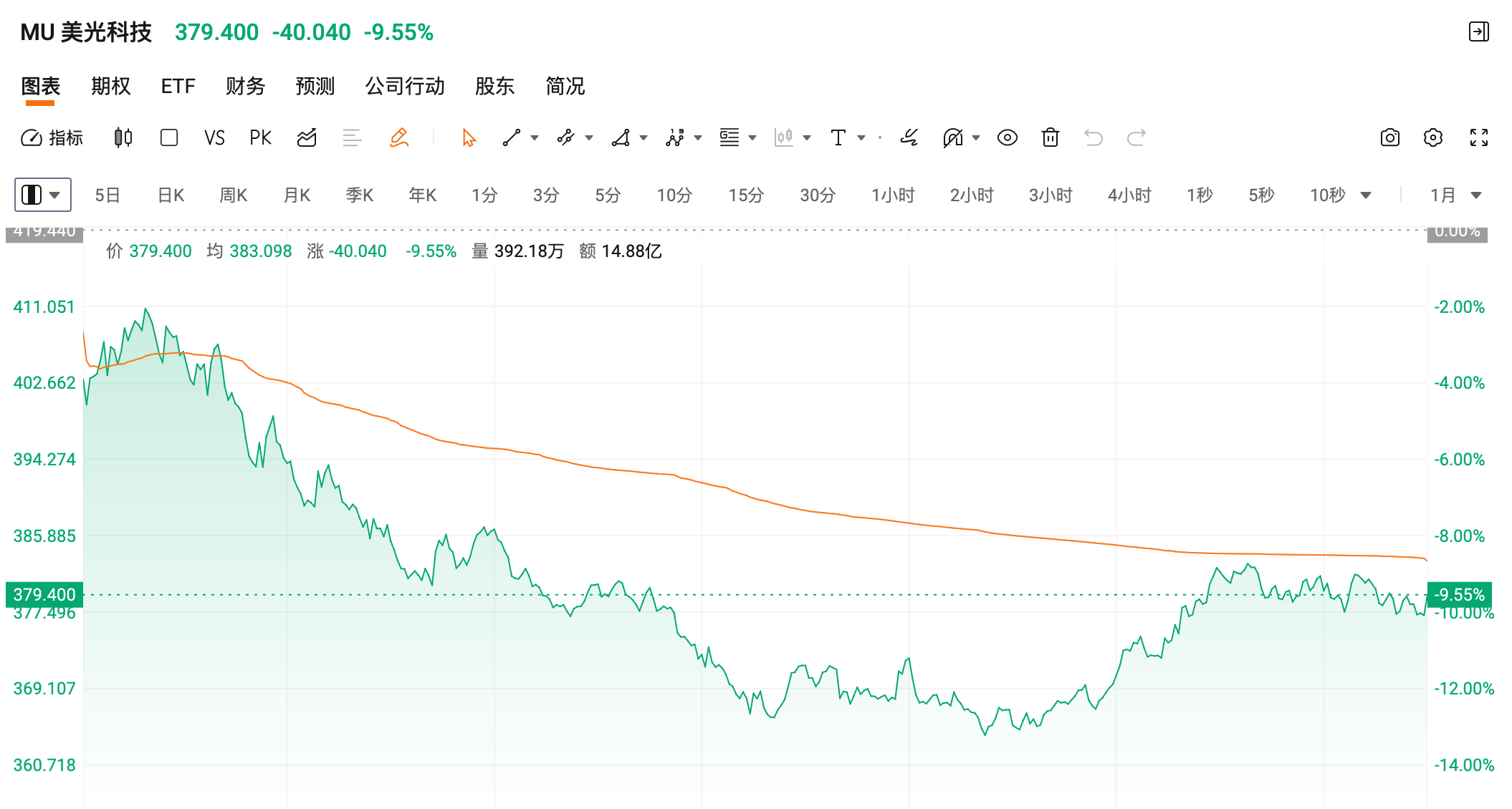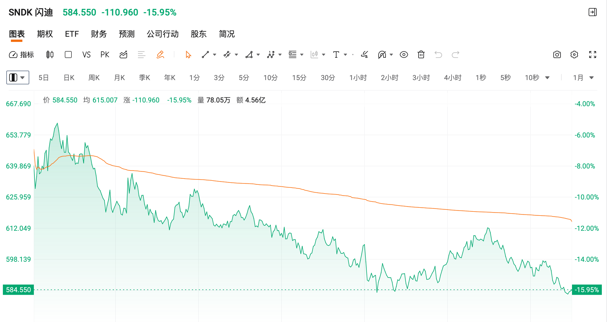 最具代表性的闪迪,一夜暴跌15.95%,美光暴跌9.55%,今早韩国股市开盘后海力士和三星跟着下跌,均跌近5%左右