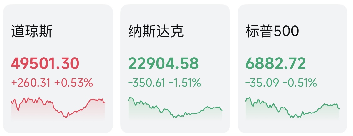 纳斯达克综合指数再度下跌,收盘跌1.51%,标普500指数收跌0.51%,道琼斯指数收涨0.53%
