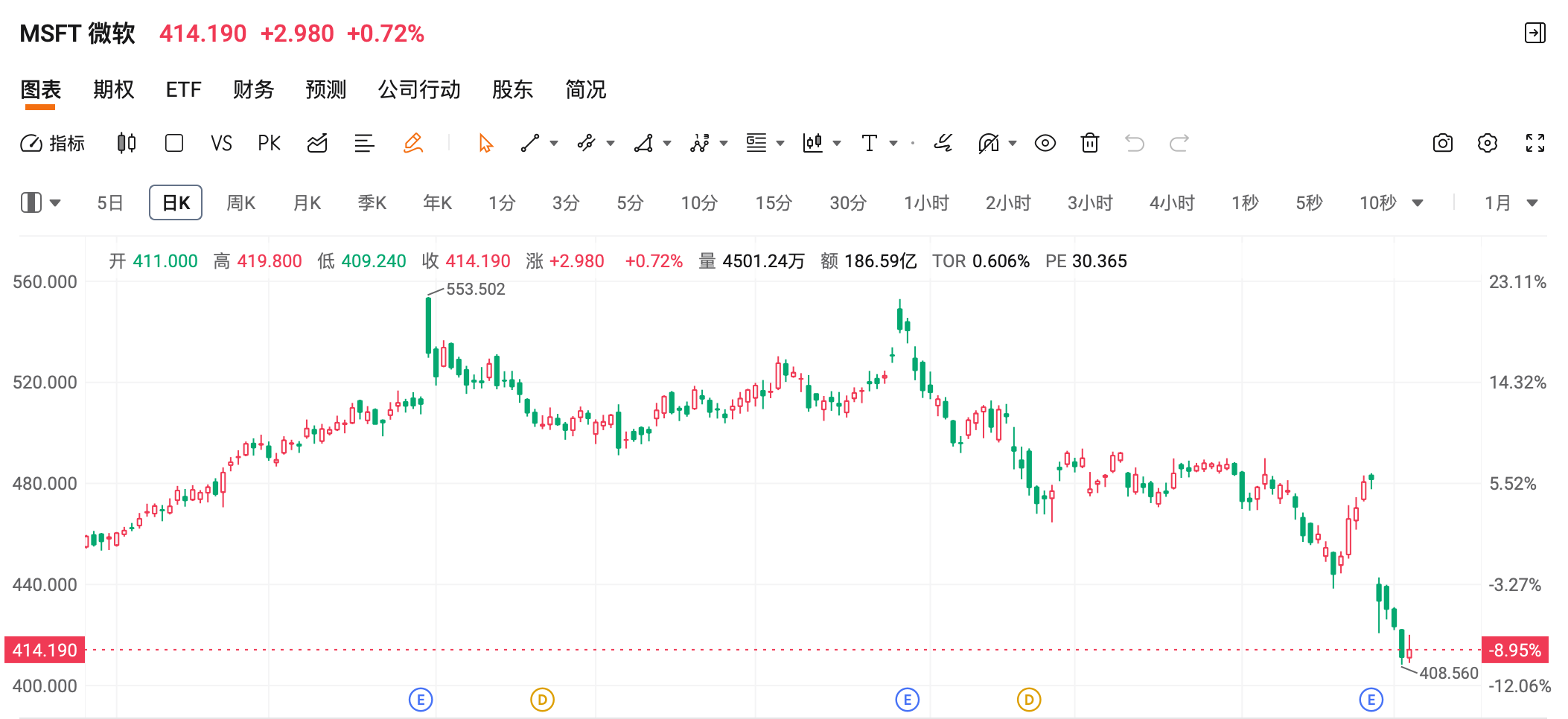 比如微软,因为云业务增速放缓,资本支出大幅增加,股价就连跌4天